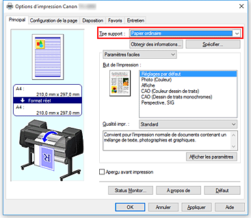 Sélectionnez le type du papier chargé dans l'imprimante dans la liste Type de support de l'onglet Principal.