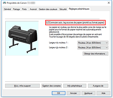 Remarque- Si l'option Commuter auto. les sources de papier (priorité au format papier) est grisée, reportez-vous à « Appliquer les paramètres de l'unité de rouleau dans le pilote d'imprimante » et définissez Unité de rouleau de la boîte de dialogue Info périphérique sur Oui.