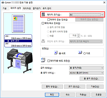 페이지 설정(Page Setup) 탭의 페이지 크기(Page Size)에서 인쇄하려는 용지의 크기를 선택합니다.