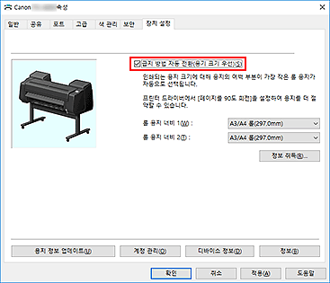 참고- 급지 방법 자동 전환(용기 크기 우선)(Automatically switch paper sources (paper size priority))이 회색으로 표시되는 경우, "롤 용지 유닛 설정을 프린터 드라이버에 반영"을 참조하여 디바이스 정보(Device Information) 대화 상자에서 롤 용지 유닛(Roll Unit)을 예(Yes)로 설정하십시오.