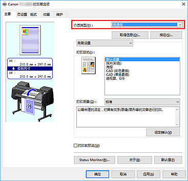 从主要选项卡的介质类型列表中选择装入打印机的纸张类型。