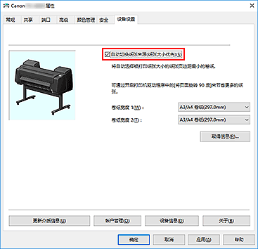 注释- 如果自动切换纸张来源(纸张大小优先)显示为灰色,请参阅“将卷纸单元设置反映至打印机驱动程序”并将设备信息对话框中的卷纸单元设置为是。