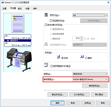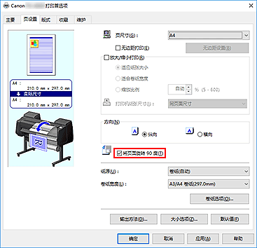 - 从页设置选项卡中选择页尺寸为纵向格式的纸张时,如果垂直方向上的长度超过在卷纸宽度中选定的宽度,则即使在将页面旋转 90 度旁添加选中标记,也不会旋转该页面。
