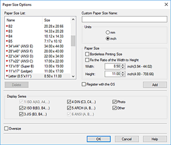Se abrirá el cuadro de diálogo Opciones de tamaños del papel (Paper Size Options).