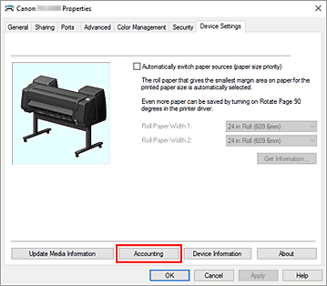 A janela de propriedades da impressora da impressora aparece.Clique em Contabilidade (Accounting) na guia Configurações de dispositivo (Device Settings)