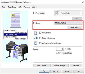 • В зависимости от условий эксплуатации использование функции Штамп (Stamp) может быть недоступно. В этом случае задайте для параметра Буферизация на драйвере принтера (Spooling at Printer Driver) в диалоговом окне Специальные настройки (Special Settings) значение Да (Yes).
