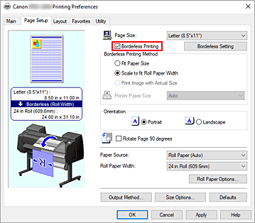 - Si coloca una marca de verificación junto a la opción Impresión sin bordes (Borderless Printing), las opciones Formato de página (Page Layout) e Impresión centrada (Print Centered) de la ficha Disposición (Layout) se mostrarán atenuadas y no podrá configurarlas.