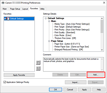 Puede registrar las opciones de impresión utilizadas más habitualmente en Favoritos (Favorites). En cualquier momento se pueden borrar los perfiles de impresión innecesarios.