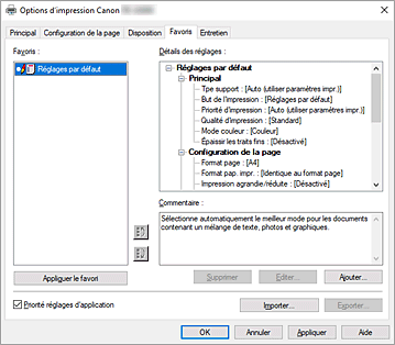 L'onglet Favoris vous permet d'enregistrer les paramètres d'impression les plus fréquemment utilisés en tant que favoris.