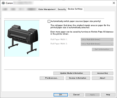 - Clique em Obter informações... (Get Information...), na guia Configurações de dispositivo (Device Settings), para obter informações sobre a largura do papel em rolo. Você pode não conseguir imprimir corretamente caso a largura do papel em rolo não esteja certa.