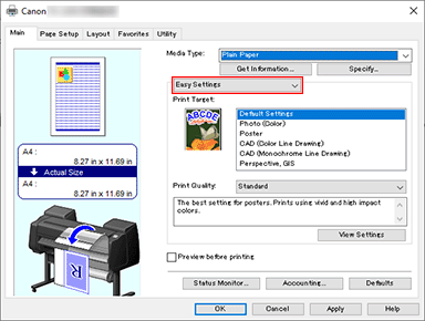 No menu suspenso, selecione Configurações fáceis (Easy Settings), depois escolha a configuração de sua preferência na lista Destino de impressão (Print Target).