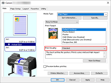 Para Qualidade de Impressão (Print Quality), selecione Alta (High), Padrão (Standard) ou Rápida (Fast) de acordo com a sua finalidade.