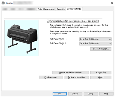 Nota- Se Alternar origs. de papel automatic. (prioridade de tam. do papel) (Automatically switch paper sources (paper size priority)) estiver esmaecido, consulte "Refletir configurações da Unidade em Rolo no Driver da Impressora" e defina Unidade em rolo (Roll Unit) na caixa de diálogo Inform. do disp. (Device Information) como Sim (Yes).