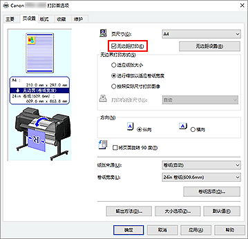 通过单击主要选项卡上的“指定...”,然后在纸张详细设置对话框的干燥时间下,将每页之间设置为较高值可以改善上述情况。 - 如果在启用设备设置选项卡的自动切换纸张来源(纸张大小优先)时进行无边距打印,则在页设置选项卡的无边界打印方式下,将只能选择进行缩放以适应卷纸宽度。 在这种情况下,通常将使用卷纸1(上部托盘中的卷纸)进行打印。 如果卷纸1中放置的纸张尺寸或类型不支持无边距打印,则无法执行无边距打印。