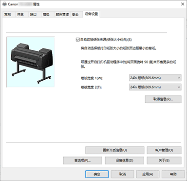 注释- 如果自动切换纸张来源(纸张大小优先)显示为灰色,请参阅“将卷纸单元设置反映至打印机驱动程序”并将设备信息对话框中的卷纸单元设置为是。