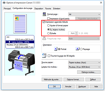 Cochez la case Impression agrandie/réduite et sélectionnez Aj. largeur rouleau.