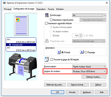 - Lorsque vous sélectionnez du papier au format portrait en tant que Format page dans l'onglet Configuration de la page, si la longueur dans le sens vertical est supérieure à la largeur sélectionnée dans Larg. rouleau, même si l'option Tourner la page de 90 degrés est cochée, la page ne sera pas tournée.