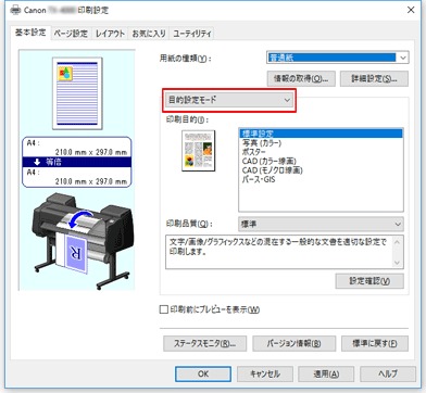 プルダウンメニューから[目的設定モード]を選び、[印刷目的]から目的に合った設定を選びます。