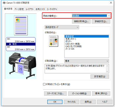 [基本設定]シートの[用紙の種類]で、プリンターにセットしている用紙の種類と同じものを選びます。