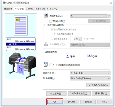 • プリンター本体の用紙の種類や、出力用紙サイズが設定されていなかったり、その他を設定している場合、[OK]はグレー表示となり、設定できません。