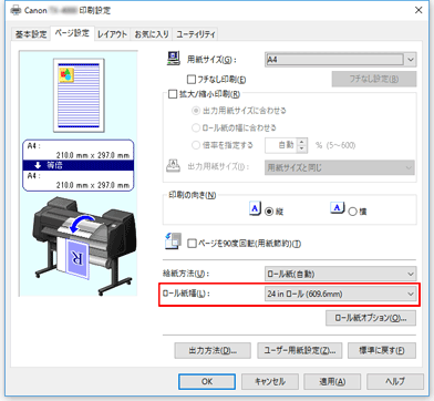 [給紙方法]でロール紙を選んだ場合は、[ロール紙幅]でプリンターにセットしているロール紙の紙幅と同じものを選びます。