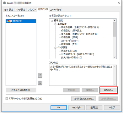 - 現在の印刷設定に適用されているお気に入りの設定は削除できません。[お気に入り一覧]から他のお気に入りを選んで[お気に入りの適用]をクリックし、他のお気に入りの設定を適用してから削除を行ってください。