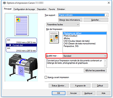 • Les paramètres de qualité d'impression qui peuvent être sélectionnés peuvent différer en fonction d'un profil d'impression.