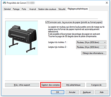 La fenêtre de propriétés de l'imprimante s'affiche.Cliquez sur Gestion des comptes dans l'onglet Réglages périphériques