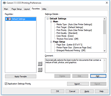 È possibile salvare le impostazioni correnti come preferiti. - Priorità impostazioni applicativi (Application Settings Priority)