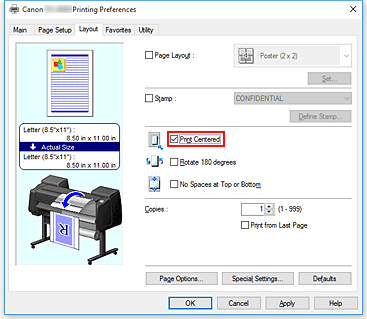 Selezionare la casella di controllo Stampa centrato (Print Centered) nella scheda Layout.