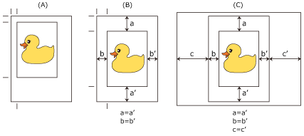 Di seguito vengono descritti i risultati di stampa con l'impostazione Stampa centrato (Print Centered). In genere, se l'impostazione Stampa centrato (Print Centered) è attiva quando il documento è stampato come in (A), questo viene stampato come in (B) per il foglio singolo e come in (C) per la carta in rotoli.