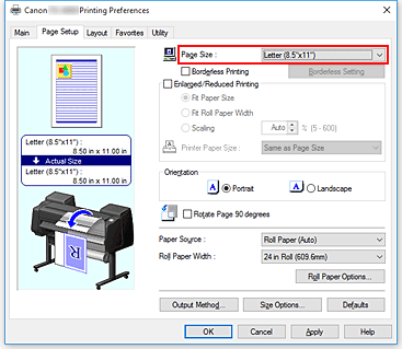 Dall'elenco Formato pagina (Page Size) presente nella scheda Imposta pagina (Page Setup), selezionare la stessa dimensione del documento creato con l'applicazione software.