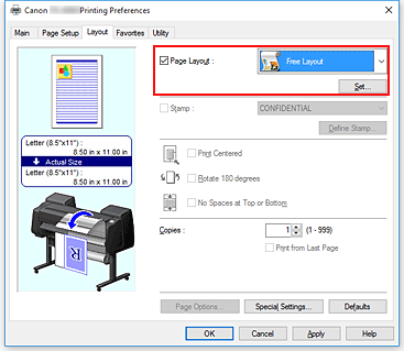 Nella scheda Layout, selezionare la casella di controllo Layout di pagina (Page Layout) e, dal menu a discesa, selezionare Free Layout.