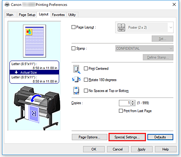 Fare clic su Impost. speciali... (Special Settings...) nella scheda Layout