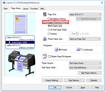 - Se si esegue la stampa ingrandita/ridotta con Cambia automaticamente la sorgente carta (priorità formato carta) (Automatically switch paper sources (paper size priority)) spuntata, Ad.a larg.carta rot. (Fit Roll Paper Width) selezionata per Stampa ingrandita/ridotta (Enlarged/Reduced Printing) nella scheda Imposta pagina (Page Setup) e Carta in rotoli (Auto) (Roll Paper (Auto)) selezionata per Alimentazione carta (Paper Source), per la stampa verrà sempre utilizzato il Rotolo 1 (carta in rotoli sul livello superiore).