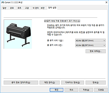 프린터 속성 창의 많은 탭은 Windows에서 제어합니다. 하지만 장치 설정(Device Settings) 탭은 프린터 구성과 관련된 설정을 지정하기 위한 탭으로 프린터 드라이버의 한 부분입니다.