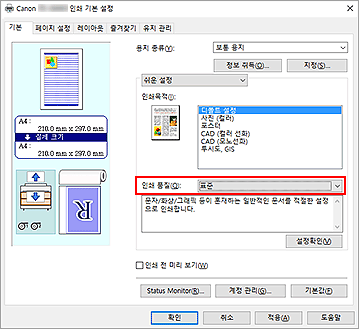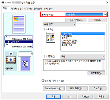 - 프린터 드라이버의 용지 설정이 프린터에 등록된 용지 정보와 다른 경우 프린터 조작판에 오류 메시지가 나타날 수 있습니다. 인쇄를 실행할 수는 있지만 올바른 인쇄 결과를 얻지 못할 수 있습니다.