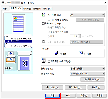 참고- 프린터에 용지 종류와 출력 용지 크기가 설정되지 않은 경우, 확인(OK)은 회색으로 표시되고 클릭할 수 없습니다.