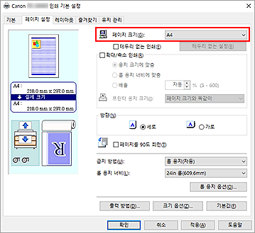 페이지 설정(Page Setup) 탭의 페이지 크기(Page Size) 목록에서 어플리케이션 소프트웨어를 사용하여 만든 문서와 같은 크기를 선택합니다.