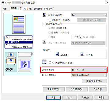급지 방법(Paper Source)에서 롤 용지를 선택한 경우 롤 용지 너비(Roll Paper Width)를 프린터에 로드된 롤 용지의 너비로 설정합니다.