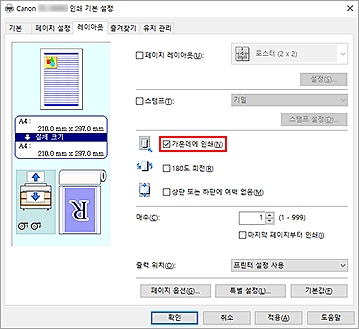 필요에 따라 확대/축소 인쇄(Enlarged/Reduced Printing) 옆의 확인란을 선택하고 목적에 따라 설정합니다.
