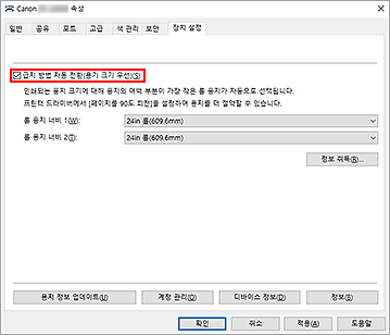 장치 설정(Device Settings) 탭에서 급지 방법 자동 전환(용기 크기 우선)(Automatically switch paper sources (paper size priority)) 확인란을 선택합니다.