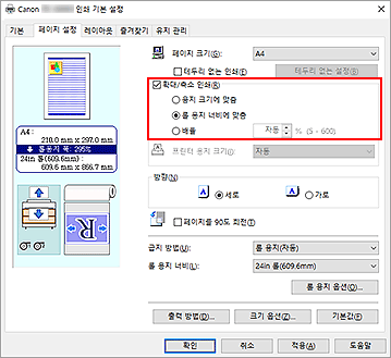 확대/축소 인쇄(Enlarged/Reduced Printing) 확인란을 선택하고 롤 용지 너비에 맞춤(Fit Roll Paper Width)을 선택합니다.