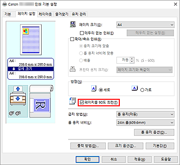 - 페이지 설정(Page Setup) 탭에서 배너 인쇄(Banner Printing) 확인란을 선택한 경우 페이지를 90도 회전(Rotate Page 90 degrees)은 회색으로 표시되고 설정할 수 없습니다.