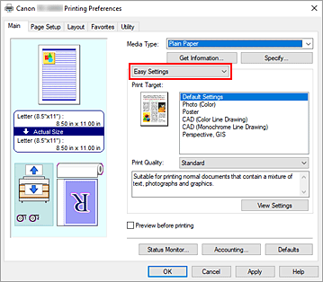 No menu suspenso, selecione Configurações fáceis (Easy Settings), depois escolha a configuração de sua preferência na lista Destino de impressão (Print Target).