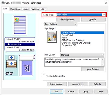 Selecione o tipo de papel da impressora na lista Tipo de Mídia (Media Type) da guia Principal (Main).