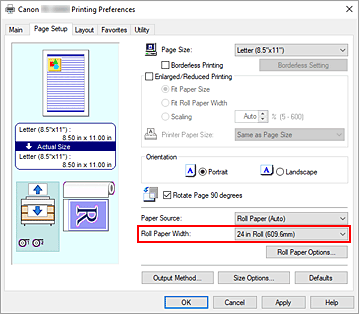Se você selecionou papel em rolo para Origem do papel (Paper Source), defina Larg. papel em rolo (Roll Paper Width) como a largura do papel em rolo carregado na impressora.