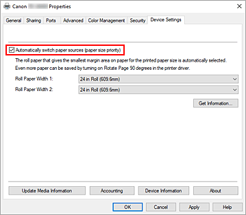 Na guia Configurações de dispositivo (Device Settings), marque a caixa de seleção Alternar origens de papel automaticamente (prioridade de tamanho do papel) (Automatically switch paper sources (paper size priority)).