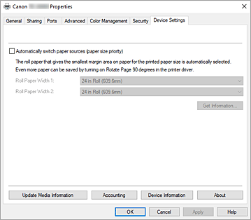 - Нажмите кнопку Получ.информацию... (Get Information...) на вкладке Настройки устройства (Device Settings), чтобы получить сведения о ширине рулона бумаги. Возможно, не удастся корректно выполнить печать, если ширина рулона бумаги установлена неверно.