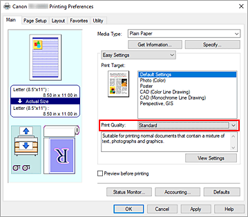 Для параметра Качество печати (Print Quality), выберите значение Высокое (High), Стандарт (Standard) или Быстрая (Fast) в зависимости от поставленной цели.